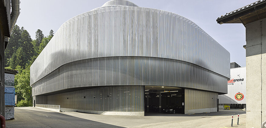 In der rund einjährigen Bauzeit entstanden ab Sommer 2023 ein Eisfeld mit darüberliegender Athletikhalle sowie Gastronomieflächen und eine Parkgarage. Der Holzbau muss hohe Anforderungen an den Brandschutz erfüllen.